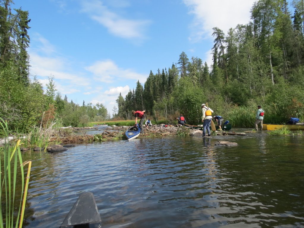 The trip included several portages because beaver dams, rapids, and waterfalls made the creeks and narrows between the lakes impassable. If we were lucky, we could simply drag our canoe over a beaver dam or get out and guide it through some small rapids. The most difficult portages occurred when we encountered a waterfall or large rapids and had to unload the canoe and carry everything around the obstacle. Some portages were short, while others were over a kilometre. To reduce the number of trips, everyone carried as much gear as possible. There were also wasps to contend with, as several of us got stung as we carried supplies and equipment along the path.