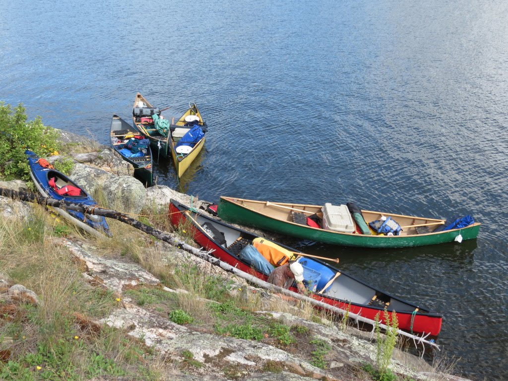 The most unforgettable portage was around some rapids that had fast-flowing water and large rocks protruding from the water. The rapids were about 100 m long and 25 m wide. Joel and Ian had completed the portage and Michelle and I were next and watched them leave. The water that flowed towards the rapids appeared calm but actually was rushing fast. Ian and Joel launched their canoe and started traveling in the front of the rapids instead of heading straight to avoid the fast-flowing water. Soon after they launched, they realized they were traveling in the wrong direction and started paddling as quickly as they could to avoid being swept back down to Sim Lake. Michelle and I watched in horror as their canoe capsized and the river swept them through the rapids and around the rocks and deposited them in the middle of the lake. Fortunately, no one got hurt, and there were some other canoeists on the lake who helped retrieve their canoe, paddles, and dry bags and bring them back to shore. Everything got soaked, but amazingly the only equipment they lost was their lawn chairs, which are now somewhere at the bottom of Sim Lake.