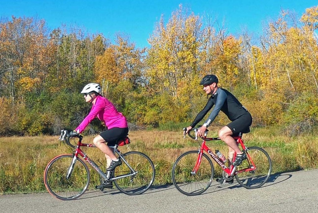 Fall is my favorite season for running. I love the crisp morning air and seeing my breath as I run on crunchy golden leaves that litter the trails. Mill Creek is now trickling over the rocks, carrying the fallen leaves downstream towards the North Saskatchewan River. I still go biking in the country with Michelle, but we wait until the afternoon when we can feel the sun’s warmth. The fields are now covered with straw-coloured stubble, and I can hear leaves rustling in the trees. I also hear Canada Geese that are flocking in the fields with their grown goslings, getting ready to migrate south for the winter.