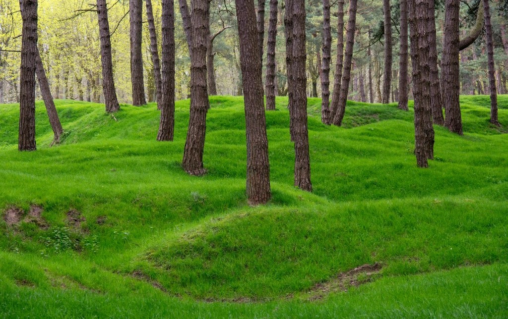 Vimy Ridge is now peaceful. Silence has replaced the noise of gunfire and explosions. The forest has healed the battlefield’s scars. In place of men fighting, people from a nearby village enjoy strolling through the tranquil park. The Vimy Ridge Monument, however, stands vigil in the distance, reminding visitors it is the resting place of Canadian soldiers, lost under the forest.
