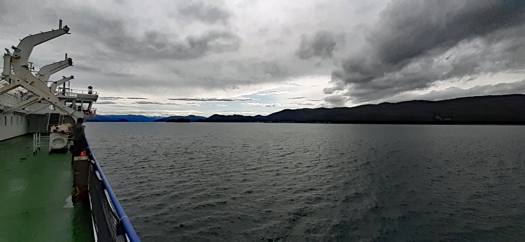 Michelle and I planned four days to get to Haida Gwaii: three days of driving to Prince Rupert and one day for the ferry ride to Skidegate. Our trip to Prince Rupert went well, but the morning of our departure to Skidegate got off to a rough start. Michelle woke up feeling dizzy and nauseated, and started vomiting. She’s had episodes of BPPV in the past, where her inner ear crystals get out of position, and movement causes mild to severe vertigo. Her last episode occurred three years ago at home; this episode occurred at the worst possible time: when she was about to embark on an eight-hour ferry trip nicknamed the vomit-comet by some travelers. While Michelle fretted about the ferry ride, I worried about causing an embarrassing delay if our low trailer hitch got stuck on the ship’s loading ramp. We were both very anxious when we arrived at the ferry terminal two hours before our departure.