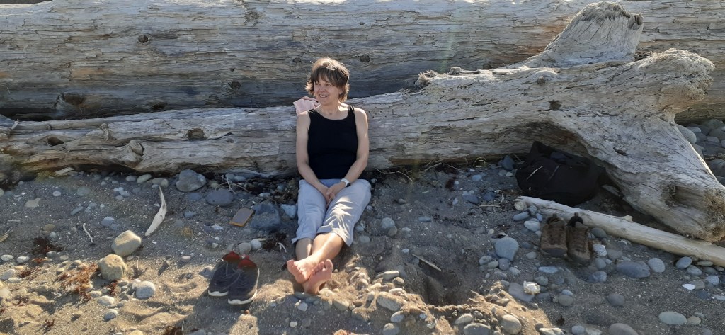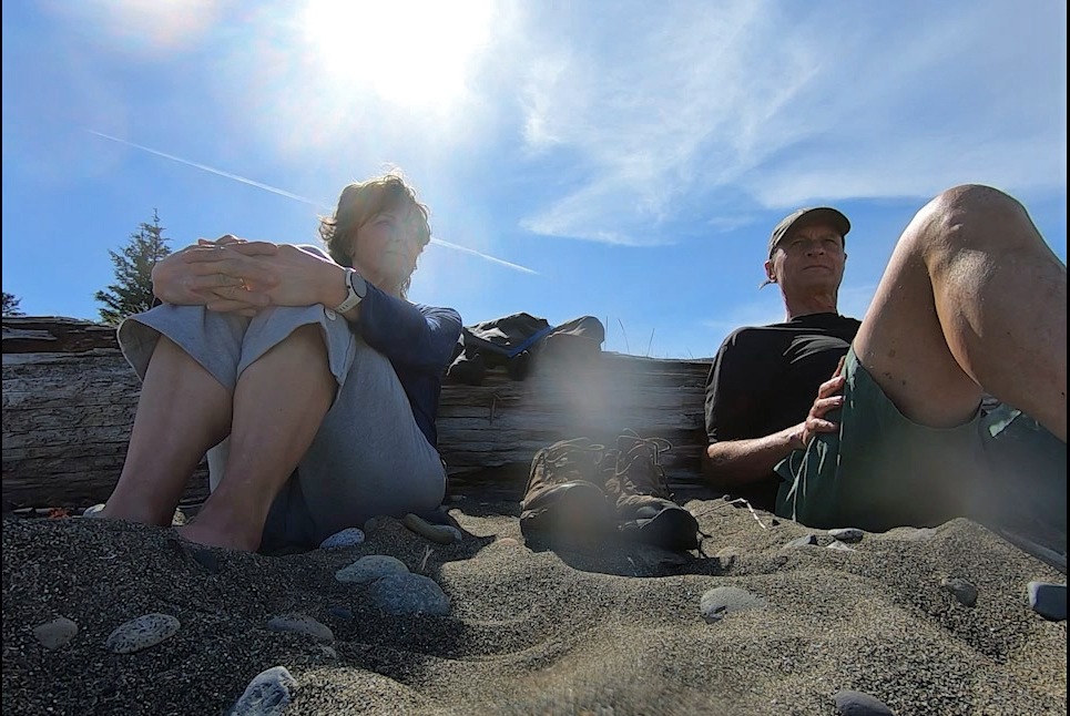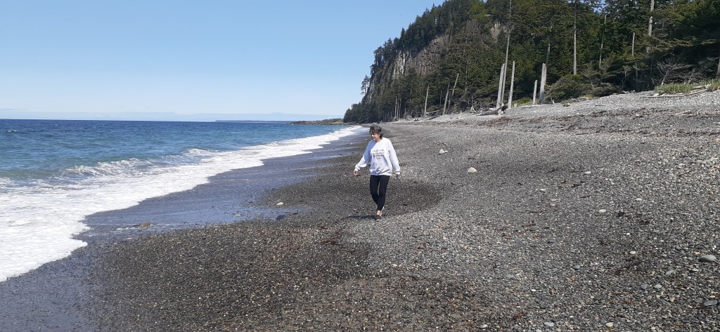 The campground was beautiful, with spruce and hemlock trees rising high above the campground. The sites were private, separated by a dense growth of Salal Berry bushes, dripping wet from a recent shower. Odors of pine and decaying wood permeated the forest. The campground was also quiet except for songbirds singing and the occasional laughter from children playing. Our campsite was a short walk to the beach, which stretched for kilometers in both directions, with huge logs of driftwood, perfect for sitting on. And nobody was there.